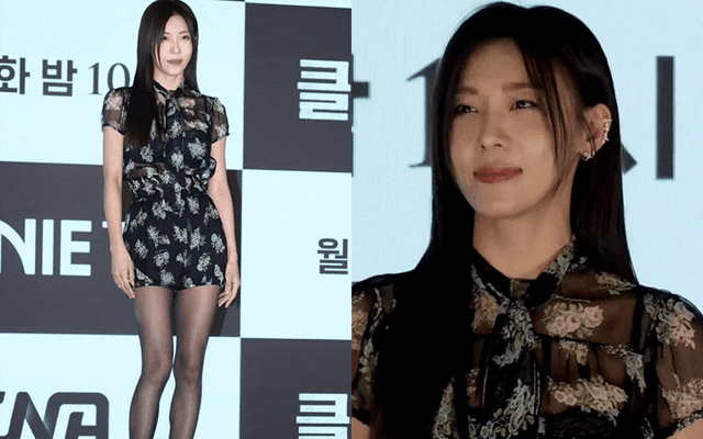Ha Ji Won diện 1 bộ jumpsuit ngắn với họa tiết hoa trên nền vải mỏng nhẹ, thiết kế cổ buộc nơ tạo điểm nhấn nữ tính, phần eo được chiết gọn giúp tôn lên vóc dáng mảnh mai của người đẹp. Cô kết hợp cùng quần tất đen mỏng và giày cao gót để làm nổi bật lên đôi chân dài thẳng tắp của mình.