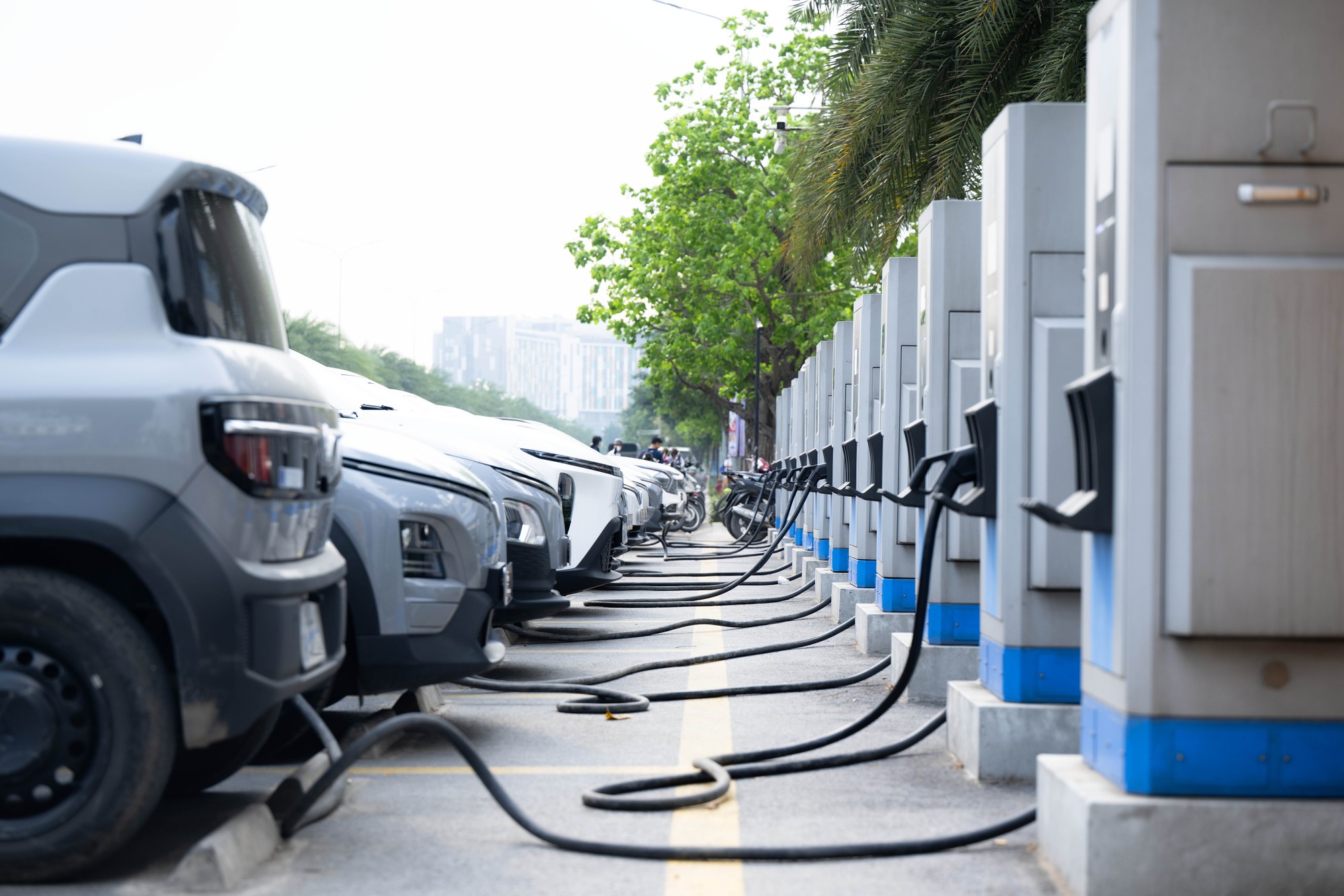 Dạo quanh các tuyến phố như Cầu Giấy, Nghĩa Đô, Phú Diễn, Tây Mỗ hay dọc trục Vành đai 1 những ngày này, hình ảnh những dải trụ sạc xanh mướt xếp hàng thẳng tắp đã trở nên quen thuộc như một phần tất yếu của đô thị.