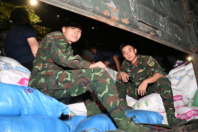 Một chiến sĩ chia sẻ: “Chúng tôi luôn sẵn sàng lên đường khi Tổ quốc và nhân dân cần. Nhìn bà con cả nước chung tay ủng hộ đồng bào vùng lũ, anh em chiến sĩ càng quyết tâm làm việc xuyên đêm để hàng hóa kịp thời vận chuyển đi sớm nhất.” (Ảnh: Như Hoàn)