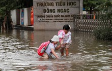 Mưa lớn sau bão số 10, phụ huynh khó khăn trong việc đưa đón con. (Ảnh: Minh Đức)