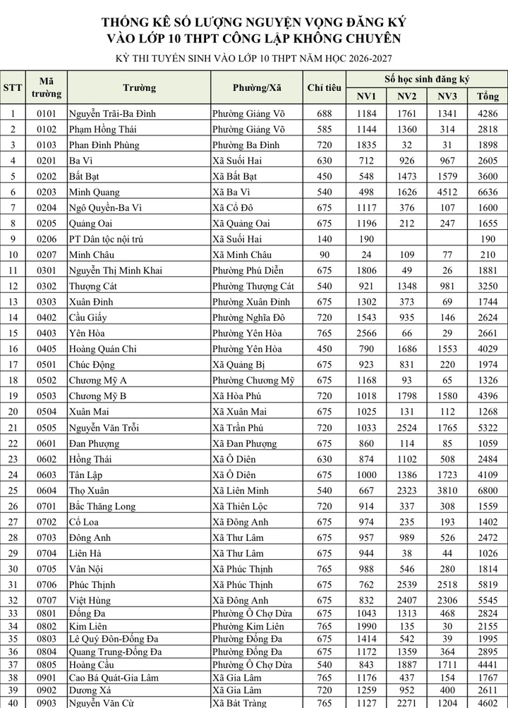 Tối 28/4, Sở GD&ĐT Hà Nội công bố tỷ lệ chọi vào lớp 10 THPT công lập năm học 2026–2027.Mức cạnh tranh cao nhất ghi nhận tại Trường THPT Yên Hòa với tỷ lệ 1 "chọi" 3,35. Năm nay THPT Yên Hòa tuyển 765 chỉ tiêu nhưng có tới 2.566 học sinh đăng ký nguyện vọng 1.