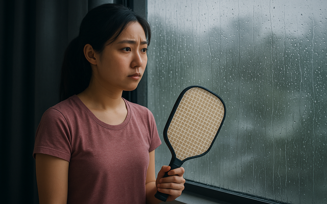 Thế rồi, trời không tạnh. Đến giờ ra sân, mưa vẫn xối xả, nước ngập đến nửa bánh xe. Các tuyến đường tắc nghẽn, xe chết máy nằm la liệt. Cả nhóm ngồi bó gối trong group chat, đành ngậm ngùi "nhượng lại" sân cho nhóm khác để gỡ gạc chút tiền. Còn Ngọc, nhìn chiếc vợt mới tinh đang nằm trên ghế, chỉ biết thở dài tiếc nuối.