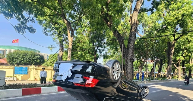 Sáng 25/11, xe ô tô con di chuyển hướng Hoàng Diệu đi Phan Đình Phùng (Hà Nội), bất ngờ mất lái, đâm vào dải phân cách rồi lật ngửa giữa đường.