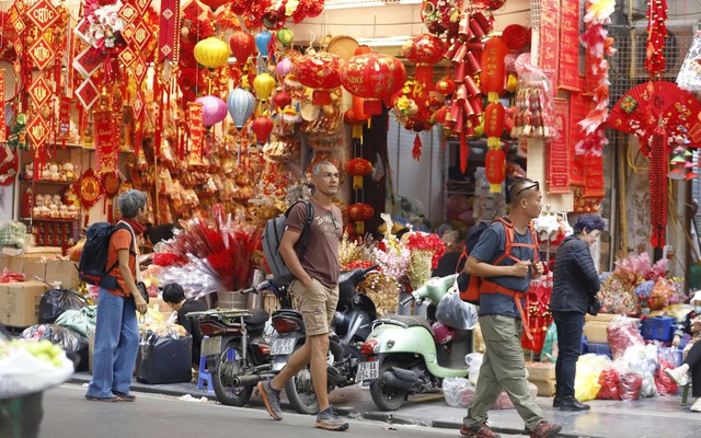 Du khách quốc tế hào hứng trải nghiệm nét văn hóa đón Tết độc đáo và chọn mua những món quà nhỏ mang đậm dấu ấn Việt Nam.