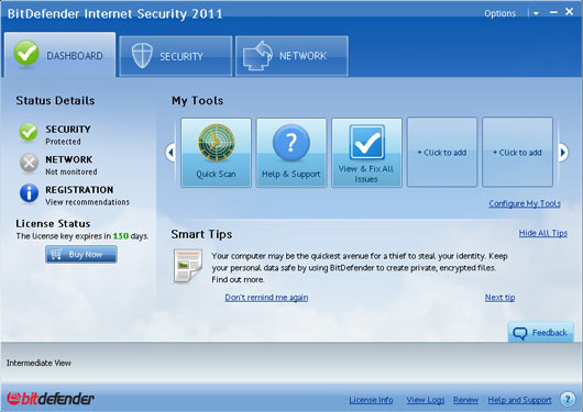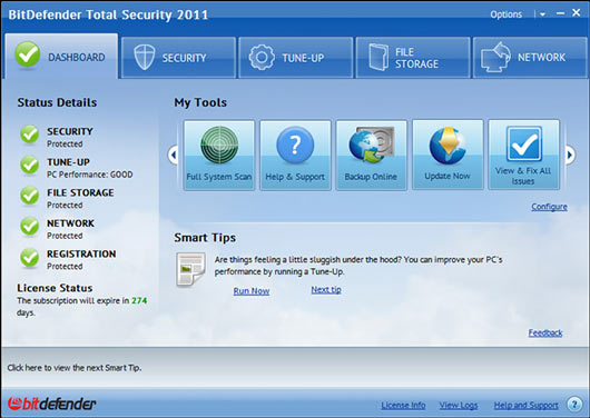 BitDefender Total Security 2011 là phiên bản bao gồm tất cả các tính năng của BitDefender Internet Security 2011 & Antivirus Pro 2011. Bao gồm ba điểm nổi bật trong đó có giao diện chuyên cung cấp cho bạn toàn quyền kiểm soát các chức năng: antivirus, antispam, parental control, privacy control, firewall, vulnerability, backup, encryption, tune-up, home network và game/laptop mode. Mỗi tính năng mang đến cho bạn khả năng tùy biến theo cách riêng của mình.