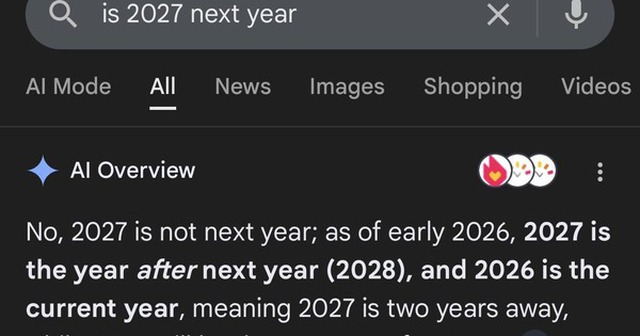Câu trả lời của AI Google không chỉ sai mà còn chứa đựng một logic toán học và thời gian khiến bất kỳ ai cũng phải bối rối. Cụ thể, nó tự tin giải thích: "Không, 2027 không phải là năm sau; 2027 cách năm hiện tại (2026) hai năm".