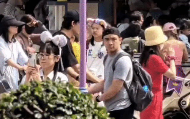 Trong 1 clip khác cũng ở Disneyland Hong Kong (Trung Quốc) mới đây, Trương Vũ Kiếm được bắt gặp đang đứng nghe tin nhắn thoại, mắt vừa dáo dác ngó quanh, dường như đang tìm kiếm hình bóng của Ngô Thiến và con gái.