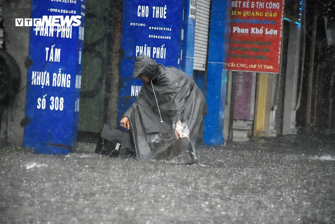 Mưa lớn khiến nhiều tuyến phố biến thành sông, nước ngập lút bánh khiến hàng loạt xe chết máy, người dân chật vật di chuyển trong làn nước mênh mông.