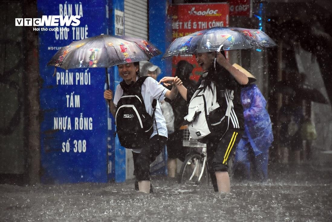Ghi nhận của PV VTC News, thời điểm học sinh đến trường, mưa vẫn xối xả. Nhiều phụ huynh, học sinh, người dân bì bõm lội trong biển nước. Thậm chí, họ phải dò từng bước để không bị vấp ngã khi nước ngập cả vỉa hè.