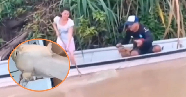 Trong clip, hai vợ chồng đang vật lộn để kéo con vật khổng lồ ra khỏi nước trong khi giữ chặt nó bằng nhiều dụng cụ đánh bắt khác nhau.