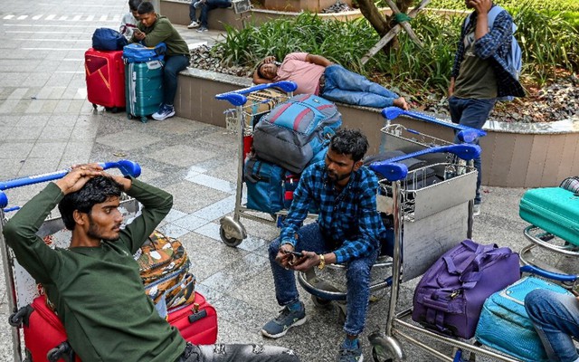 Hành khách bị mắc kẹt chờ đợi tại nhà ga khởi hành ở Mumbai vào ngày 1 tháng 3 năm 2026 sau khi hai hãng hàng không tư nhân lớn nhất của Ấn Độ là IndiGo và Air India đình chỉ các chuyến bay đến tất cả các điểm đến ở Trung Đông. Ảnh: Punit PARANJPE/AFP