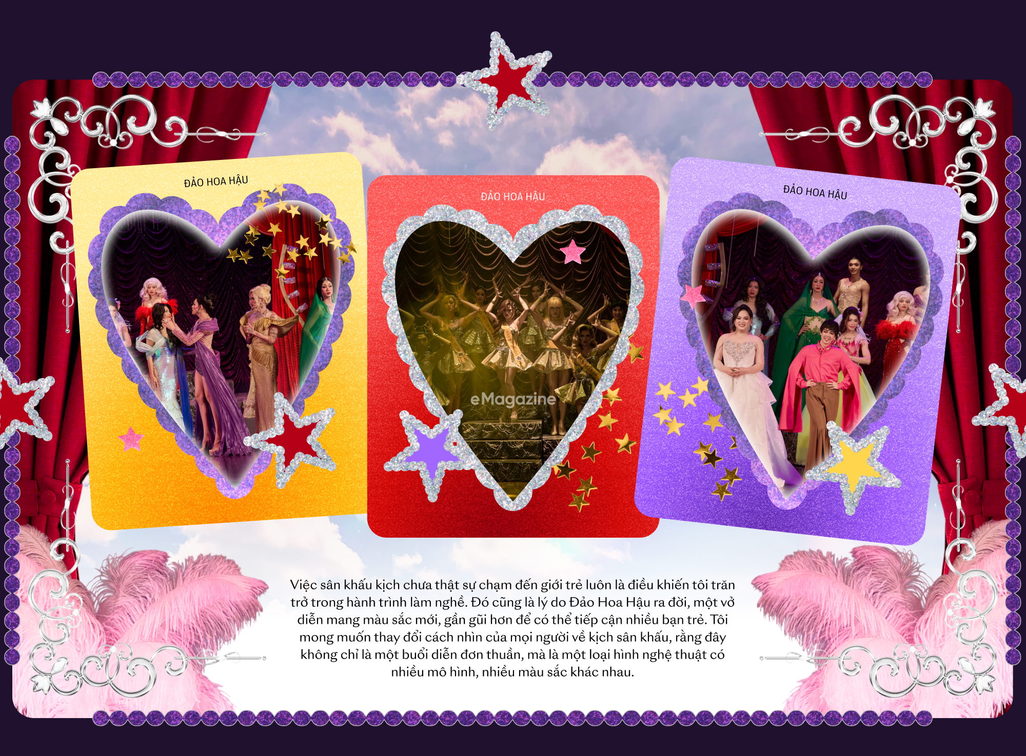 Hiện tại, Đảo Hoa Hậu đã vượt ngoài kỳ vọng ban đầu của tôi với vai trò đạo diễn sân khấu. Lúc bắt tay vào làm, tôi chỉ mong dựng được một vở diễn có khán giả, có người biết đến và sân khấu luôn được sáng đèn. Tôi muốn có một không gian để diễn viên chúng tôi được công nhận đúng với nghề mình theo đuổi. Thực tế, ngoài một số anh chị đi trước, phần lớn chúng tôi vẫn thường được nhìn nhận ở góc độ content creator, dù nhiều người đều được đào tạo từ trường Sân khấu - Điện ảnh. Chúng tôi chưa có nhiều nền tảng để phát triển tên tuổi hay hình ảnh cá nhân, nên TikTok gần như là nơi duy nhất để thỏa sức với đam mê. Sau Đảo Hoa Hậu, điều khiến tôi vui nhất là các bạn diễn viên, những người bạn, người em của mình đã có thêm cơ hội được khán giả công nhận. Từ đó, các bạn tự tin hơn vào bản thân và có thể tiếp tục theo đuổi, làm những điều mình thật sự yêu thích.