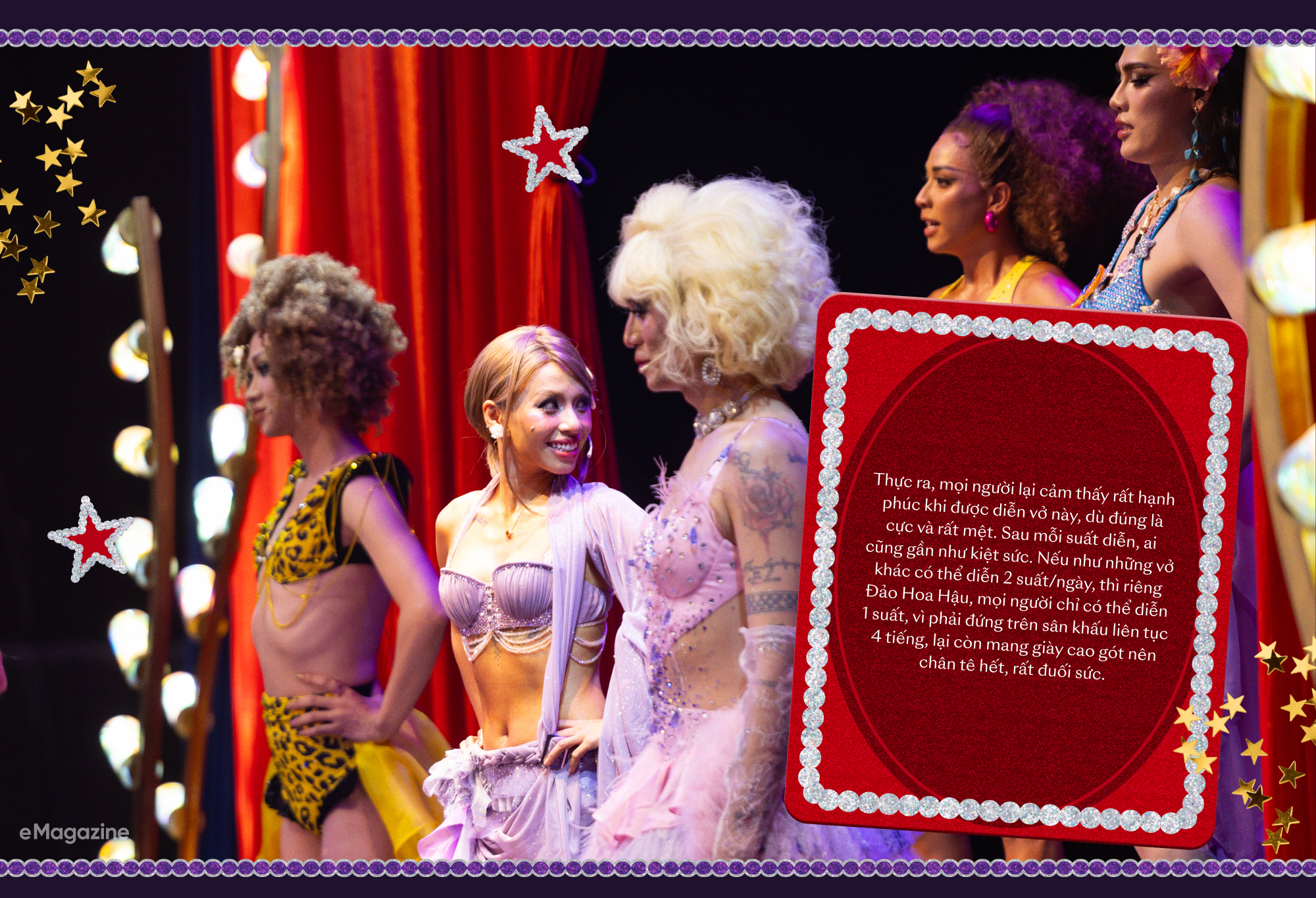 Thực ra, mọi người lại cảm thấy rất hạnh phúc khi được diễn vở này, dù đúng là cực và rất mệt. Sau mỗi suất diễn, ai cũng gần như kiệt sức. Nếu như những vở khác có thể diễn 2 suất/ngày, thì riêng Đảo Hoa Hậu, mọi người chỉ có thể diễn 1 suất, vì phải đứng trên sân khấu liên tục 4 tiếng, lại còn mang giày cao gót nên chân tê hết, rất đuối sức. Dù vậy, trước mỗi lần lên sân khấu, ai cũng háo hức. Không khí hậu trường lúc nào cũng đông vui, nhộn nhịp như một cuộc thi thật sự. Hơn nữa, đây cũng là dịp hiếm hoi để anh chị em diễn viên có thể gặp gỡ đầy đủ, nên mỗi lần diễn đều rất nhiều năng lượng và cảm xúc.