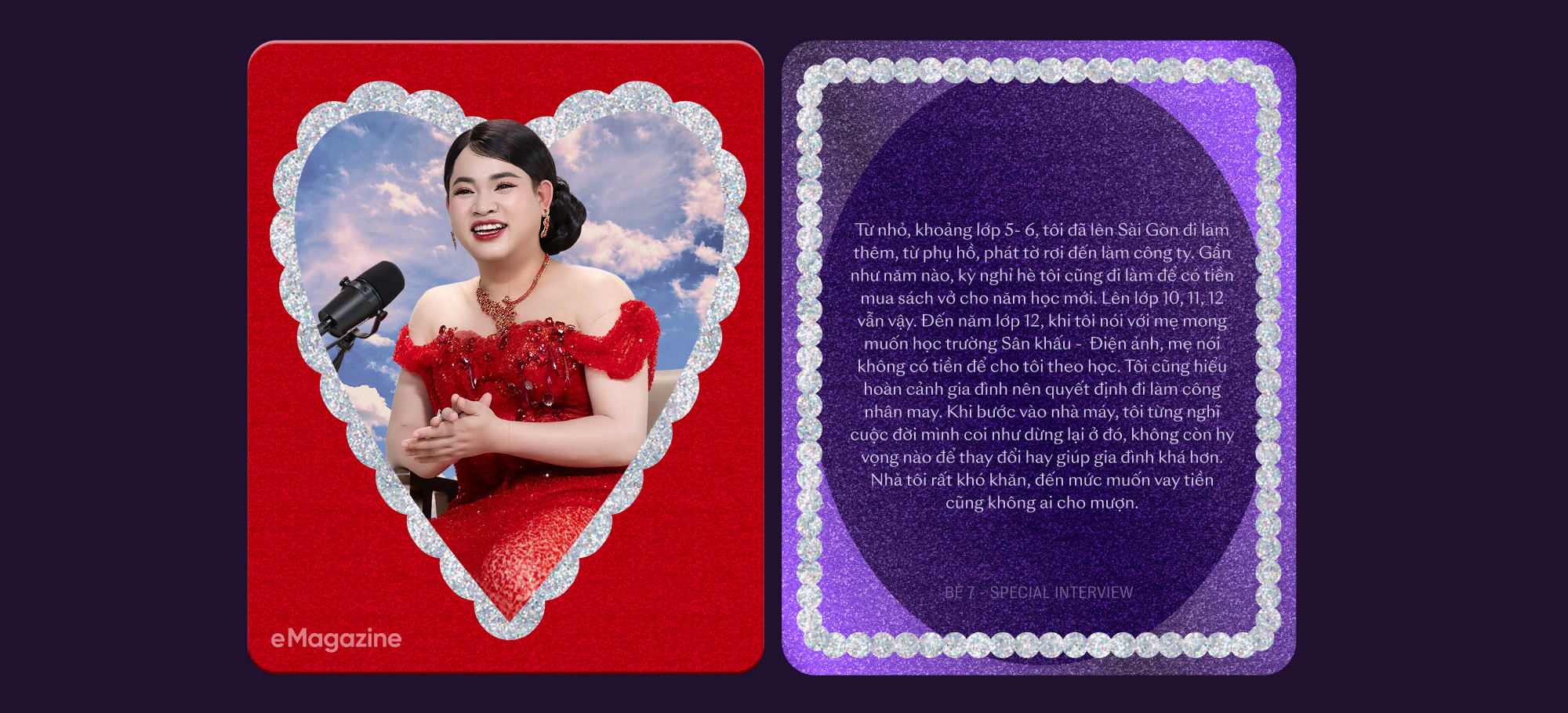 Phía sau ánh đèn sân khấu, cuộc sống của tôi luôn đi kèm với những áp lực gia đình mà tôi ít khi chia sẻ. Từ năm lớp 5, lớp 6, tôi đã bắt đầu lên Sài Gòn làm đủ nghề, từ phụ hồ, phát tờ rơi đến làm thuê cho các công ty. Suốt những năm học trung học, kỳ nghỉ hè nào tôi cũng đi làm để tự lo tiền sách vở cho năm học mới. Đến năm lớp 12, khi tôi bày tỏ mong muốn thi vào trường Sân khấu - Điện ảnh, mẹ bảo nhà không có tiền để tôi theo học. Hiểu chuyện, tôi chấp nhận gác lại giấc mơ để đi làm công nhân may. Những ngày đầu trong nhà máy, tôi từng tuyệt vọng nghĩ rằng cuộc đời mình vậy là dừng lại ở đó, sẽ chẳng còn cơ hội nào để thay đổi hay giúp gia đình khá hơn. Nhà tôi vốn dĩ rất khó khăn, nghèo khó đến mức đi vay mượn chẳng ai cho.