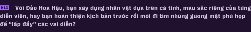 Khi bắt đầu viết kịch bản Đảo Hoa Hậu, tôi đã mời dần các diễn viên, và ai đồng ý thì tôi sẽ bắt đầu lên từng outline phù hợp với hình ảnh và cá tính của họ. Áp lực đầu tiên của tôi là khâu dàn dựng bố cục: Làm sao để tính toán, cân đo đong đếm để mọi người đều có đất diễn tương đồng nhau. Áp lực thứ hai đến từ chính nguồn năng lượng dồi dào của cả ekip; tôi phải tìm cách điều phối, cân bằng để tất cả cùng tỏa sáng và không một ai bị bỏ lại phía sau.