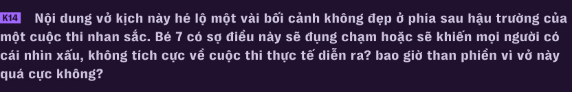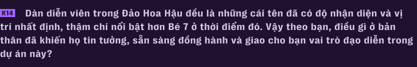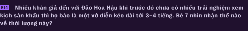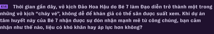 Đảo Hoa hậu là vở kịch đầu tay của tôi, khi được nhiều người biết đến và yêu thương, chắc chắn tôi và những diễn viên trong vở kịch rất hạnh phúc. Khi bắt tay vào làm vở này, cái tên Bé 7 của tôi còn rất mới nên chắc chắn sẽ có không ít khó khăn. Tôi tự đặt áp lực cho mình, để không phụ lại lòng tin của những anh chị tiền bối, những đồng nghiệp đã tin tưởng tôi mà tham gia. Không chỉ vậy, ban giám đốc sân khấu và cả khán giả cũng đặt niềm tin vào tôi. Khi ra mắt Đảo Hoa hậu, trong mắt nhiều người, tôi vẫn chỉ là một content creator, chưa thực sự được công nhận ở vai trò đạo diễn, nên áp lực rất lớn. May mắn là sự đoàn kết của tất cả anh chị em trong vở diễn đã tạo nên một điểm tựa rất lớn, giúp tôi vượt qua giai đoạn khó khăn ban đầu. Tôi mong khán giả đón nhận, yêu thương, nhìn nhận tôi ở góc độ là một đạo diễn mới. Hy vọng nếu sau này tôi dựng những vở khác, mọi người sẽ chăm chút cho tôi nhiều hơn để tôi có thể học hỏi nhiều hơn, có thể làm được nhiều vở được như Đảo Hoa Hậu.
