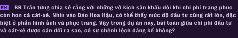 Công bằng mà nói, với sân khấu kịch, mức cát-xê chỉ có thể ở một giới hạn nhất định. Riêng với Đảo Hoa Hậu, cát-xê của diễn viên có tăng lên khá nhiều, nhưng thực tế vẫn không đủ để chi trả cho một buổi diễn, vì còn rất nhiều khoản khác như make-up, phục trang. Nhiều bộ đồ chúng tôi đi mượn, nhưng vẫn phải gửi lại chi phí giặt ủi cho các anh chị. Dù nhận được sự hỗ trợ khá nhiều, nhưng vẫn không thể bù hết chi phí (cười). Nói thẳng ra, diễn viên gần như phải "gồng lỗ" để diễn vai.