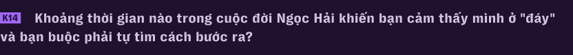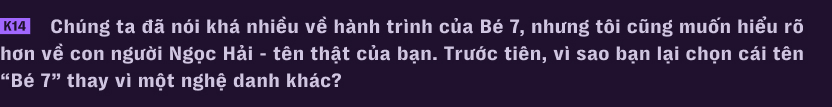 Tôi cảm thấy hai phiên bản này hoàn toàn khác nhau. Khi xuất hiện trong hình ảnh này, tôi là Bé Bảy. Nhưng khi tháo tóc ra và trở lại là Ngọc Hải, mọi người sẽ thấy tôi là một con người khác hẳn, không còn giống như vậy nữa. Ở đời thường, Ngọc Hải là người không thích sự xô bồ, thích những điều đơn giản và không quen với nơi đông người. Tôi thích có một không gian riêng cho mình.