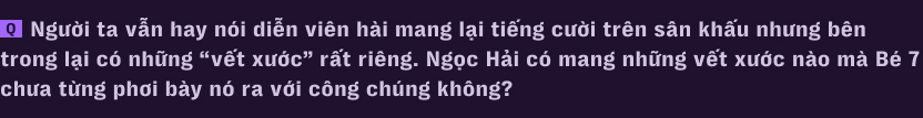 Đó cũng là lý do tôi hạn chế xuất hiện với hình ảnh nam tính trên mạng xã hội. Khi làm nghệ thuật, tôi là Bé Bảy, nhưng khi trở về cuộc sống đời thường, tôi được là Ngọc Hải - một người có thể thoải mái trò chuyện và gắn kết với gia đình nhiều hơn. Đến giờ tôi vẫn chưa tự giải thích được điều này: Bởi cứ hễ đội tóc giả vào, tôi như biến thành một con người khác. Để rồi khi tháo tóc ra, mọi người sẽ thấy một Ngọc Hải rất trầm lặng, thậm chí là có thể rơi nước mắt.