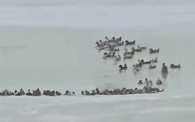 Bởi lẽ, hiếm ai gặp cảnh đàn vịt “đạp gió rẽ sóng” đúng nghĩa như này. Biển rộng mênh mông, sóng lớn khiến cả đàn vịt cũng trở nên nhỏ bé, chông chênh. Những chú vịt tụ lại thành từng cụm nhưng bị sóng đánh dạt liên tục, lúc nổi lúc chìm.