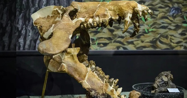 Hộp sọ của một con heo địa ngục được trưng bày tại Đài tưởng niệm Quốc gia John Day Fossil Beds (bang Oregon - Mỹ) - Ảnh: ALAMY