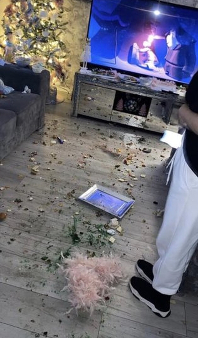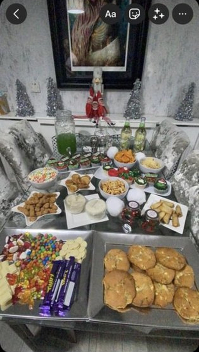 Trước khi Grinch đến, Laura đã cẩn thận chuẩn bị các món vặt như bánh cookie, gà rán, khoai tây chiên và các món ăn nhẹ ngon lành khác. Nhưng trong bức ảnh tiếp theo, cô cho thấy căn phòng khách hoang tàn với những mảnh vỡ rơi vương vãi khắp nơi.