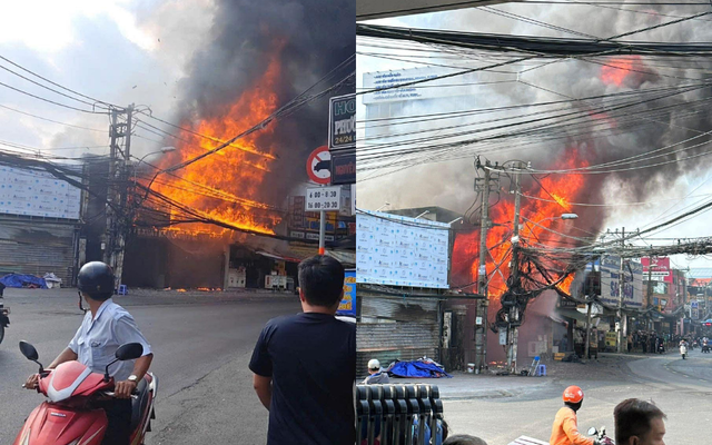 Do cửa hàng chứa nhiều vật dụng dễ cháy nên đám cháy nhanh chóng lan rộng, lửa đỏ rực bao trùm cả khu vực, khói đen cuồn cuộn bốc cao.