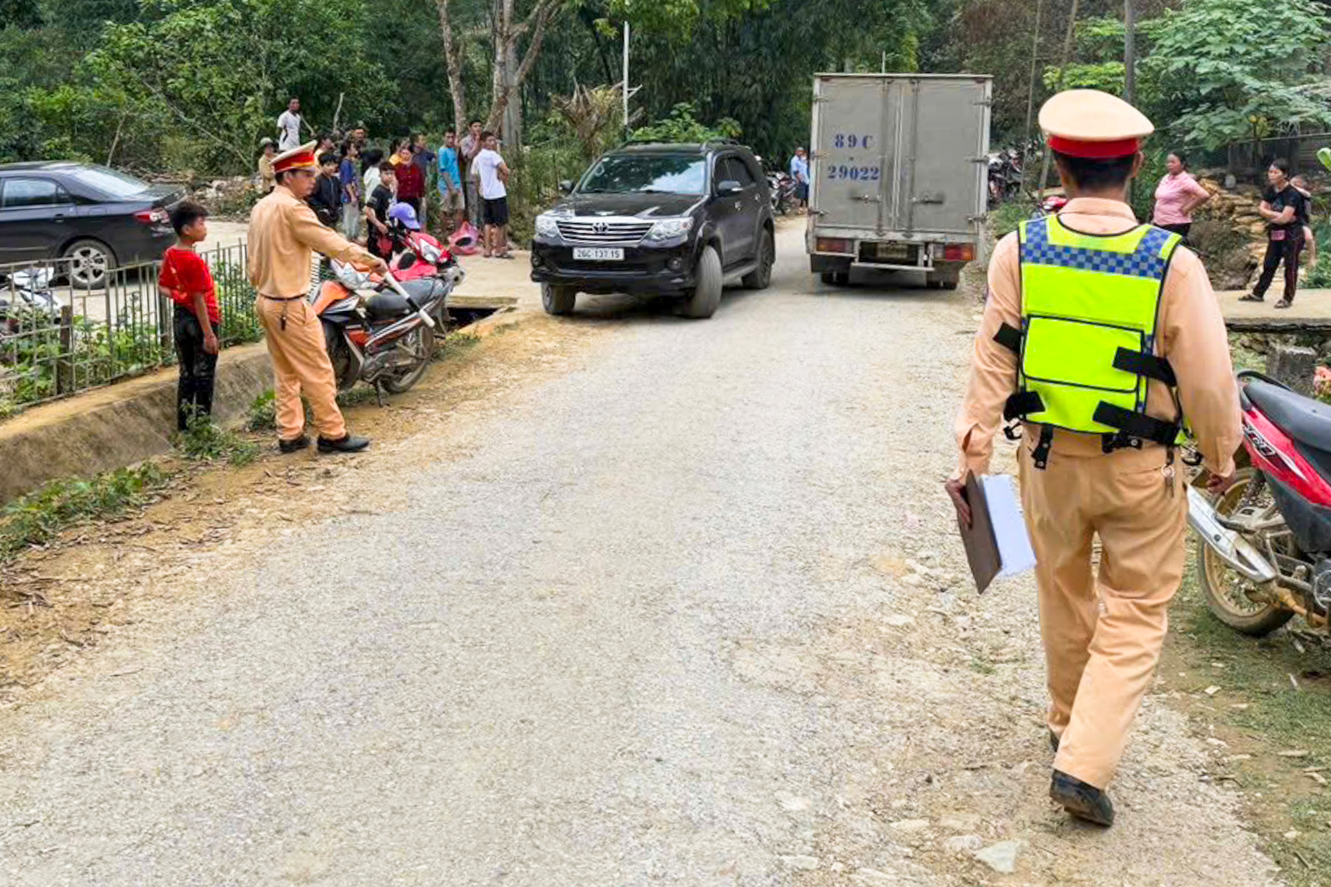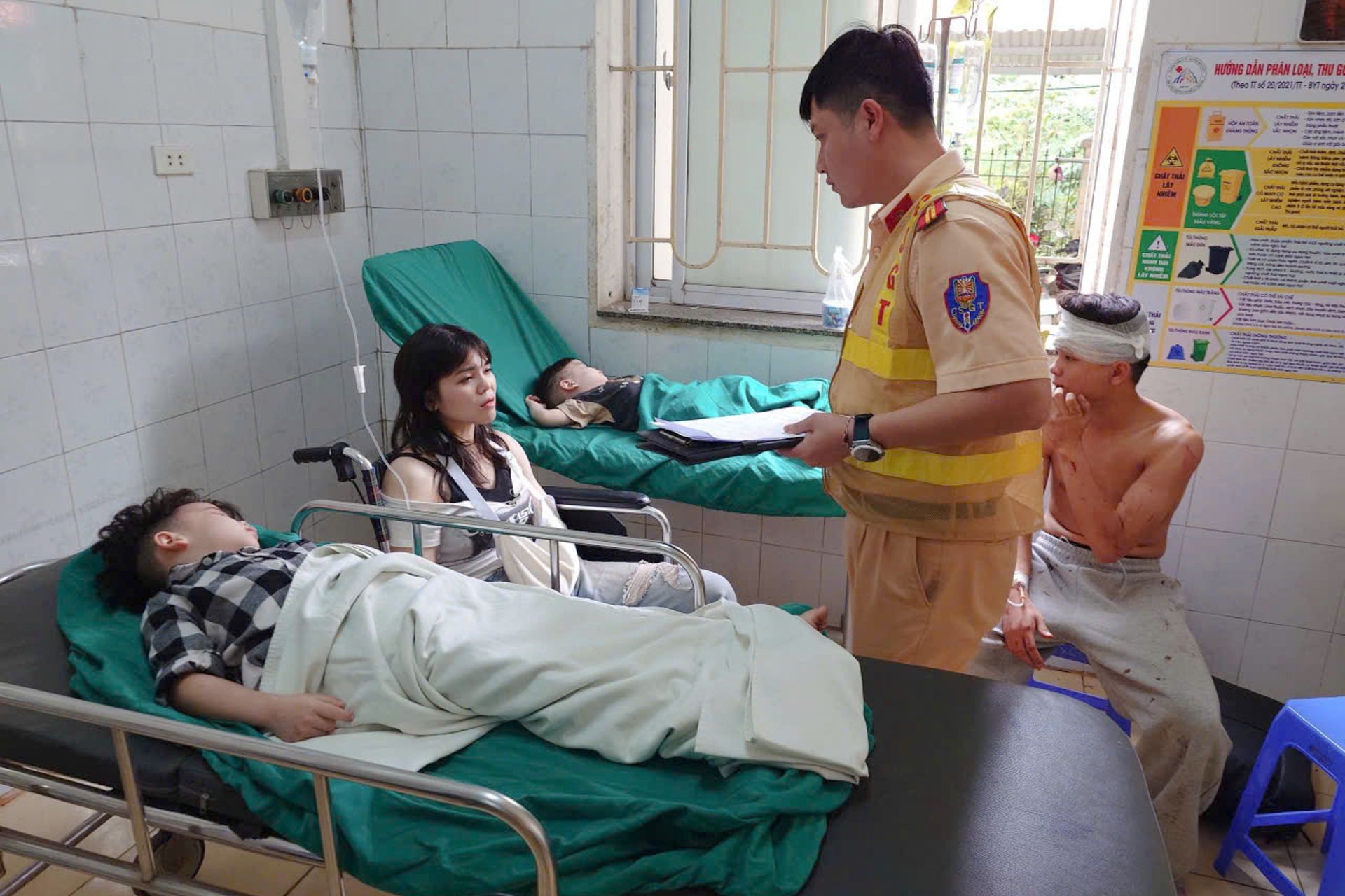Cán bộ Phòng CSGT Công an tỉnh Sơn La hỏi thăm tình hình sức khỏe của những người bị thương