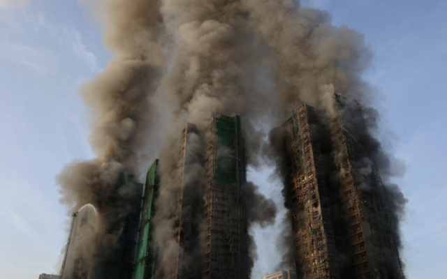 Cư dân tuyệt vọng tên là Wong đã gục ngã và khóc nức nở bên ngoài tòa tháp đang cháy. Anh nói vợ anh bị mắc kẹt bên trong tòa nhà xảy ra hoả hoạn. (Ảnh: Reuters)