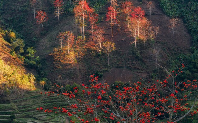 Hoa gạo có khắp núi rừng Sơn La, nhưng quyến rũ nhất phải kể đến vùng ven Sông Đà thuộc Quỳnh Nhai. Mỗi mùa hoa nở, sắc đỏ như ngọn lửa bừng lên giữa trời nước mênh mang, níu chân du khách.