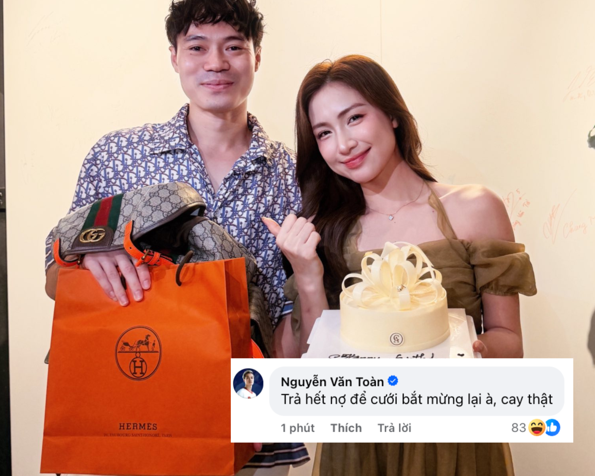 Trên trang cá nhân, Hoà Minzy đăng ảnh rạng rỡ bên Văn Toàn cùng một chiếc bánh kem nhỏ xinh. Thế nhưng, tâm điểm lại nằm ở túi quà cam của Hermès và chiếc túi Gucci trên tay nam cầu thủ.
