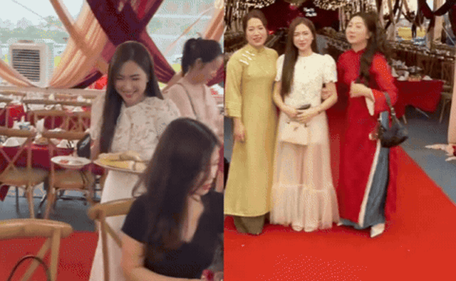 Không dừng lại ở đó, những khoảnh khắc "dở khóc dở cười" tiếp tục diễn ra khi Hòa Minzy đứng chụp ảnh kỷ niệm cùng các chị gái của Văn Toàn trên thảm đỏ rạp cưới. Trong không khí rộn ràng, một người quen của gia đình đã cố tình trêu đùa, gọi cô nàng là "em dâu hụt" của nhà họ Nguyễn. Hai chị gái của Văn Toàn cũng hùa theo gọi nữ ca sĩ là "em dâu hụt" trong tiếng cười của mọi người.