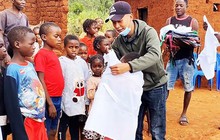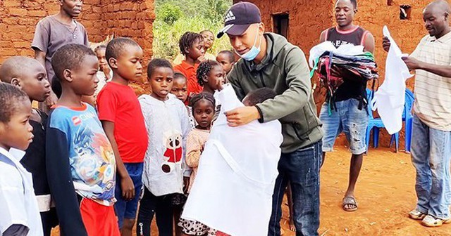 Hình ảnh Phạm Quang Linh trao đồng phục, cặp sách hỗ trợ trẻ em ở làng Sanzala (huyện Bailundo, tỉnh Huambo, Angola) đến trường học. (Nguồn: Mạng xã hội)