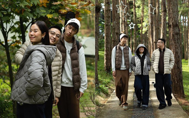 Gia đình Tròn Mama chọn cho mình phong cách tối giản với những chiếc áo khoác PUFFTECH được phối "ton-sur-ton", không chỉ giữa các thành viên mà còn với cảnh trời Đà Lạt giữa rừng thông nâu và những vòm lá vàng.