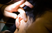 - Trùm khăn lên đầu sao cho phần khăn ở 2 bên bằng nhau. Chia tóc làm 2 phần, đặt vào trong lớp khăn và quấn kín lại.