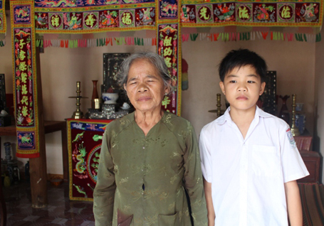 Bà Châu và em Tin bên bàn thờ của bố mẹ em.