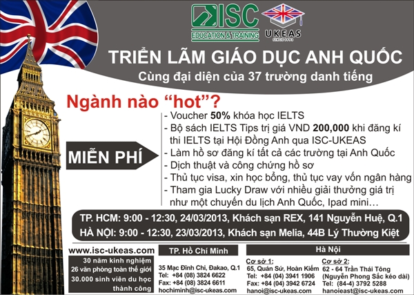 Tham gia Triển lãm giáo dục Anh Quốc mang tên “Ngành gì hot?” tổ chức bởi ISC-UKEAS cùng đại diện của 38 trường danh tiếng tại Anh để có được những thông tin cụ thể nhất về các chương trình học, các yêu cầu cần thiết và học bổng.
