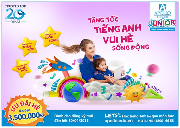 Đối với các bạn học sinh đã dành 9 tháng trên lớp miệt mài với bài vở thì việc học hè chẳng còn chút hấp dẫn nào. Hiểu được tâm lý đó, Tổ chức GD&ĐT Apollo Việt Nam (Apollo English) luôn chủ trương xây dựng những chương trình học tiếng Anh hè thật thoải mái, thú vị, kích thích và khuyến khích tinh thần học tập và sáng tạo cũng như mang lại hiệu quả tối ưu cho học viên. Chị Hà, một phụ huynh ở Hà Nội hồ hởi chia sẻ: "Bạn Bin (8 tuổi) nhà mình lúc bảo đi học hè thì không chịu đâu. Nhưng đến học thử ở Apollo Junior một buổi là thay đổi ngay, đòi mẹ cho đi học vì lớp rất vui, khác hẳn không khí ở trường". Những tín hiệu tích cực này là nhờ Apollo English đã cho ra đời và áp dụng phương pháp LETSTM (Học tiếng Anh qua môn học) - phương pháp mới đây đã vinh dự được nhận Huy chương Vàng của Bộ GD&ĐT cho "Phương pháp dạy tiếng Anh hiệu quả nhất cho trẻ 3-16 tuổi".