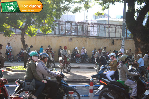Các phụ huynh phải dắt xe sang phía bên kia đường cho thông thoáng.