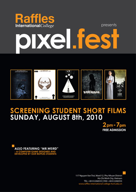 Quốc Tế Raffles lại trân trọng tổ chức buổi liên hoan phim ngắn Pixel.fest để trình chiếu 4 tác phẩm phim ảnh ấn tượng và 1 trò chơi trên máy tính của các bạn sinh viên tài năng khối ngành