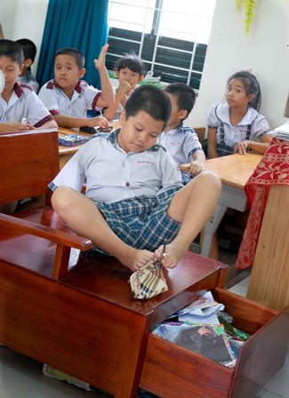 Cậu bé ngồi đầu lớp trên chiếc bàn đặc biệt được thiết kế dành riêng cho mình.
