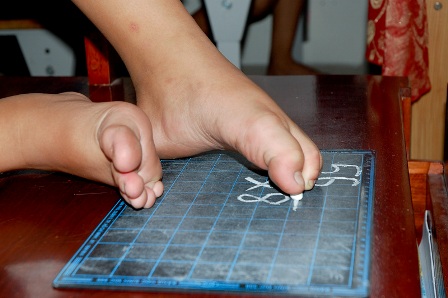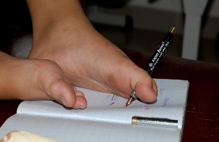 Hùng đang viết bằng chân