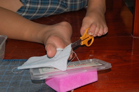 Dùng chân cắt vải trong bài tập thủ công