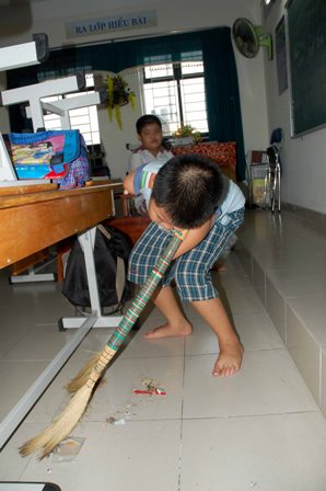 Đặc biệt, Hùng rất thích lao động như cầm chổi quét nhà, quét lớp, tưới cây…