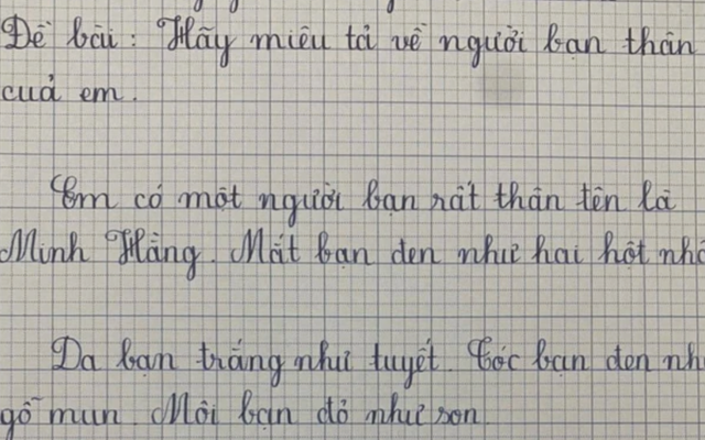 Không như nhiều bạn cùng lớp miêu tả theo cách riêng, học sinh này lại bê nguyên hình mẫu nhan sắc của Bạch Tuyết sang để tả bạn mình. Trong bài văn, học sinh viết: “Em có một người bạn rất thân tên là Minh Hằng. Mắt bạn đen như hai hột nhãn. Da bạn trắng như tuyết. Tóc bạn đen như gỗ mun. Môi bạn đỏ như son. Hàng ngày, em với bạn Hằng thường rủ nhau đi học. Em rất yêu quý bạn Minh Hằng”.