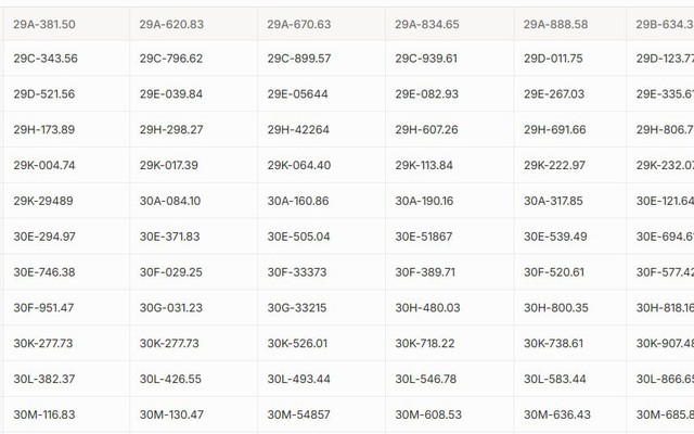 29N1-166.45; 29K1-184.56; 29V9-2617; 29L5-006.86; 29F1-181.72; 29S2-039.91; 29S2-176.62; 29N1-092.76; 29T1-815.99; 30Z9-6737; 29AH-089.03; 29K1-379.85; 29T1-670.81; 30X8-55.09; 30F2-1250; 29Z1-406.47; 29Y1-490.45; 29AA-591.90; 29T2-055.89; 30L6-2374; 29AH-067.80;