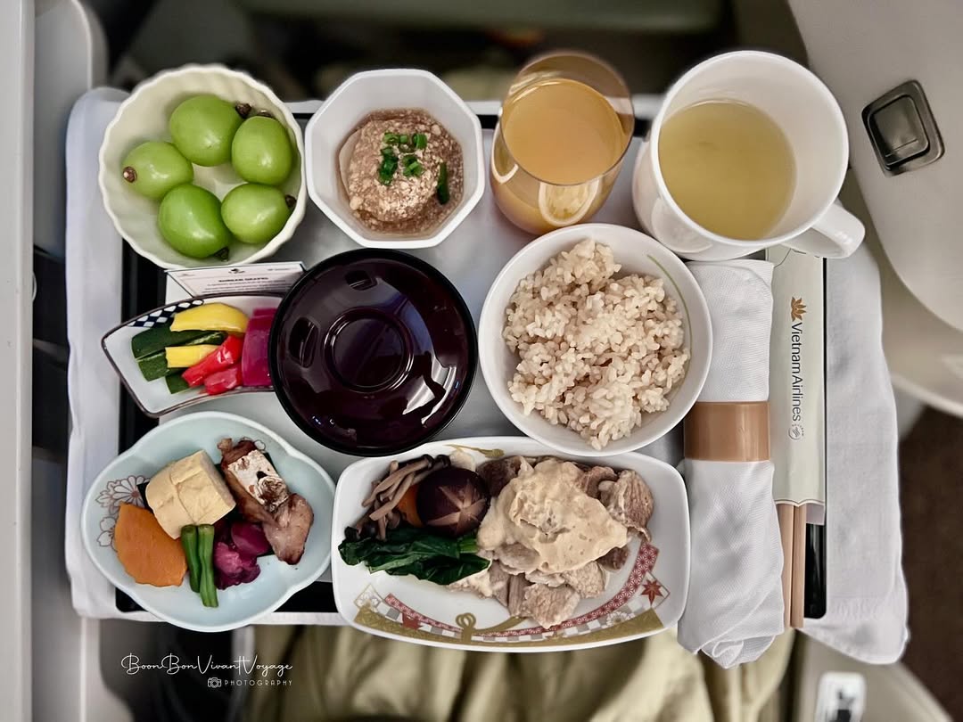 Khi bay ở hạng thương gia, hành khách có rất nhiều lựa chọn về ẩm thực đa dạng (Ảnh: @boonbonvivantvoyage)