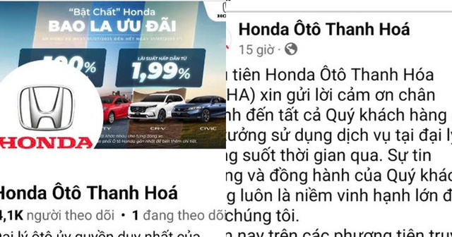 Ngày 13-10, đại diện Honda Ôtô Thanh Hóa (HTHA) xác nhận đơn vị đã có thông tin đăng trên trang Facebook Honda Ôtô Thanh Hóa về việc xuất hiện thông tin, hình ảnh trên mạng xã hội liên quan tới hoạt động kinh doanh của đại lý.