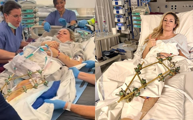Hiện tại, nữ vận động viên vẫn chưa thể tự đứng vững và đang chờ đợi những ca phẫu thuật tiếp theo để tháo bỏ khung sắt cố định.