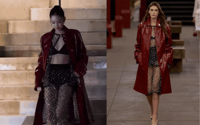 Outfit dự show của Jennie vốn đã "đủ wow" với lớp váy lưới đính kết xuyên thấu táo bạo, khoe khéo nội y tối giản bên trong, tạo nên vẻ gợi cảm một cách đầy tinh tế. Khi bước ra khỏi sàn diễn, Jennie đã nâng tầm outfit bằng cách khoác thêm chiếc áo trench da đỏ nổi bật. Sắc đỏ trầm cùng bề mặt da bóng tạo hiệu ứng thị giác mạnh mẽ, khiến tổng thể trở nên quyền lực và sắc sảo hơn hẳn. Chiếc áo khoác dáng dài không chỉ đóng vai trò điểm nhấn mà còn giúp cân bằng lại độ “nóng” của lớp váy xuyên thấu bên trong.